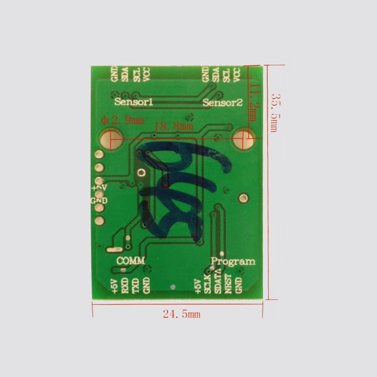 When using two sensors, it is necessary to update the MCU's program with the burn-writer, and also to configure the address. Two Sensor PCB, one chip selects 0: R31 connected with 0 ohm resistor, but R32 is not connected; For the other chip, 1: R32 is connected with 0 ohm resistor, and R31 is not connected.
